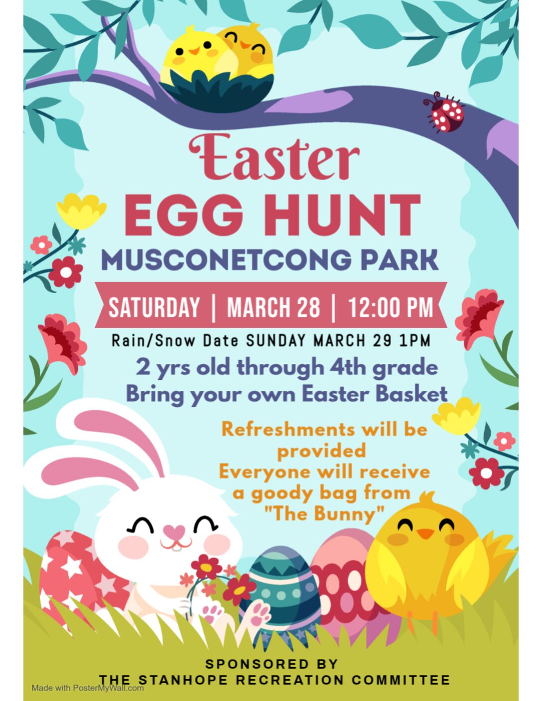 Lake Musconetcong Park 46 Musconetcong Ave, Stanhope, NJ, United StatesThe annual Easter Egg Hunt will be held on Saturday, March 28th, at 12:00pm, at Musconetcong Park. (The rain/snow date is Sunday, March 29th, at 1:00pm) The Egg Hunt is open to children from 2 years of age to those in 4th grade. Bring your own Easter Basket. Refreshments will be provided and everyone will...