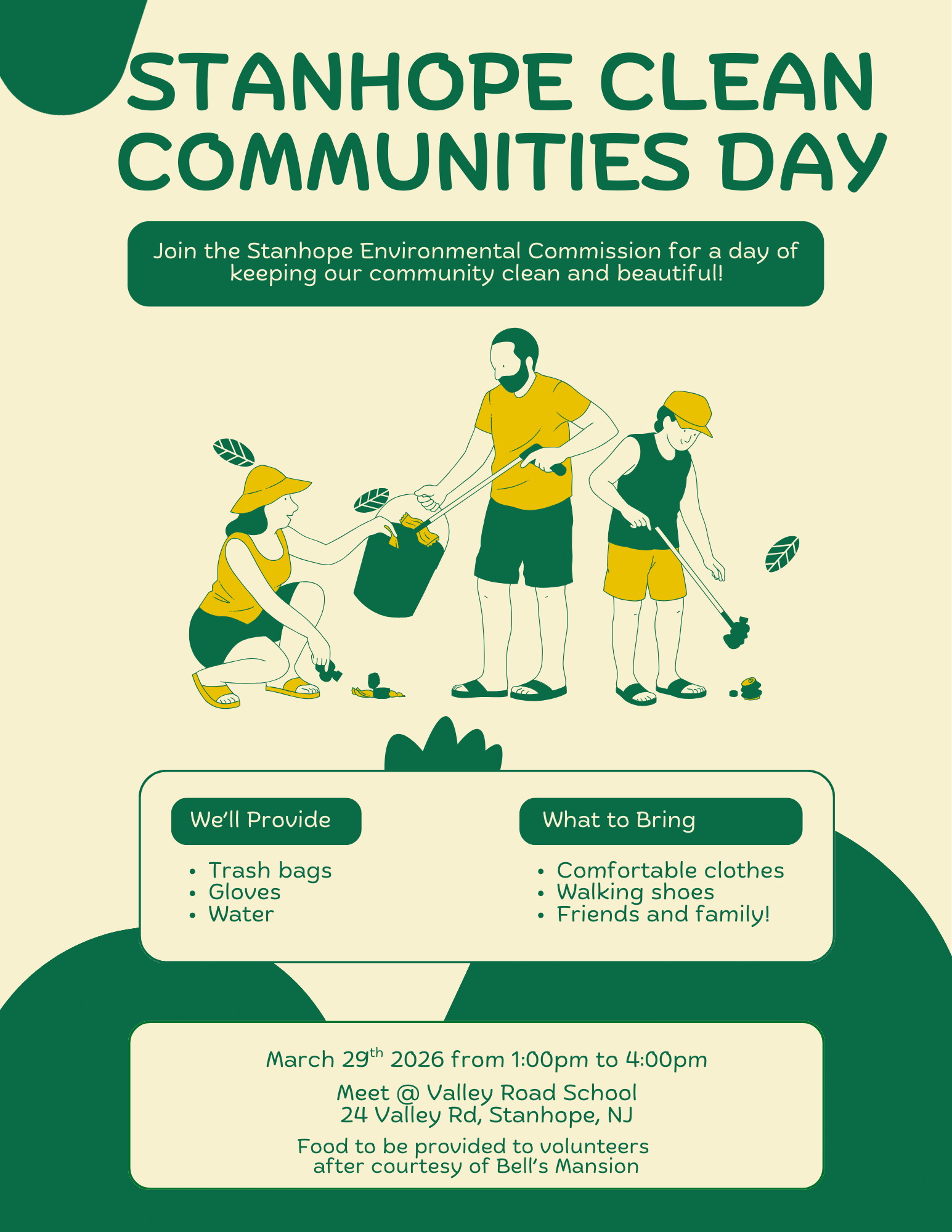 FeaturedStanhope Valley Road School 24 Valley Road, Stanhope, NJ, United StatesPlease come out for Stanhope's annual Clean Communities Day, Sunday, April 27th, from 1-4 PM. We will meet at the Valley Road School. The public is invited to pick up supplies at the school and then proceed to the Borough property for clean up. Non-profits should register with six or more members. Let's celebrate Earth...